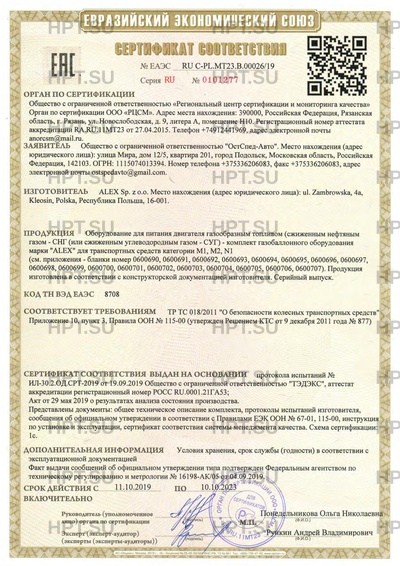 - Оборудование для питания двигателя газообразным топливом (сжиженным нефтяным газом - СНГ (или сжиженным углеводородным газом - СУГ) - комплект газобаллонного оборудования марки "ALEX" для транспортных средств категории М1, М2, N1