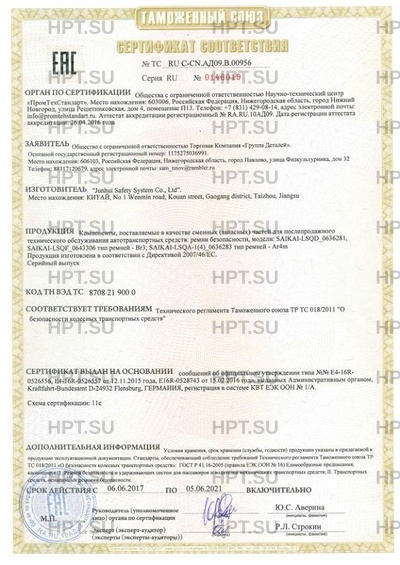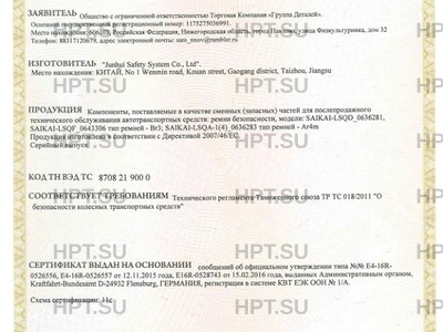 Компоненты, поставляемые в качестве сменных (запасных) частей для послепродажного технического обслуживания автотранспортных средств: ремни безопасности,