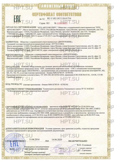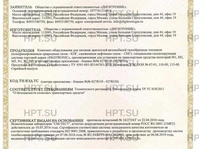 - Комплект оборудования для питания двигателей автомобилей газообразным топливом (компримированным природным газом - КПГ, сжиженным нефтяным газом – СНГ): специальная газодозирующая система торговой марки «DIGITRONIC», предназначенная для установки на транспортные средства категорий М1, М2, М3, N1, N2, N3,