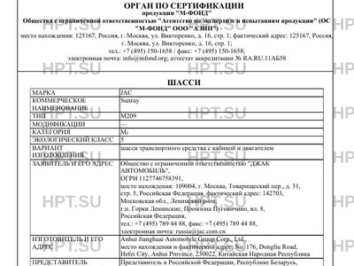 | Заявитель | Общество с ограниченной ответственностью "ДЖАК АВТОМОБИЛЬ", ОГРН 1127746758391, место нахождения: 109004, г. Москва, Товарищеский пер., д. 31, стр. 5, Российская Федерация, фактический адрес: 142703, Московская обл., Ленинский р-он, г.п. Горки Ленинские, Промзона Пуговичино, вл. 8, Российская Федерация, тел.: +7 (495) 789 44 88, факс: +7 (495) 789 44 88, электронная почта: russia@jac.com.cn |