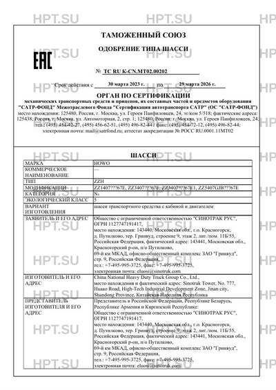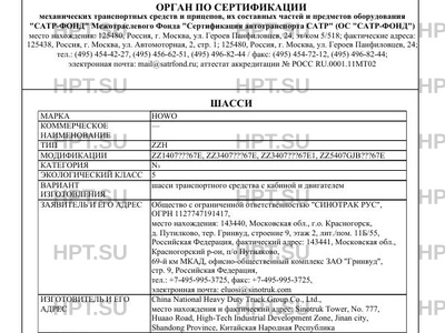 | Заявитель | Общество с ограниченной ответственностью "СИНОТРАК РУС", ОГРН 1127747191417, место нахождения: 143440, Московская обл., г.о. Красногорск, д. Путилково, тер. Гринвуд, строение 9, этаж 2, лит./пом. 11Б/55, Российская Федерация, фактический адрес: 143441, Московская обл., Красногорский р-он, п/о Путилково, 69-й км МКАД, офисно-общественный комплекс ЗАО "Гринвуд", стр. 9, Российская Федерация, тел.: +7-495-995-3725, факс: +7-495-995-3725, электронная почта: eluosi@sinotruk.com |