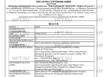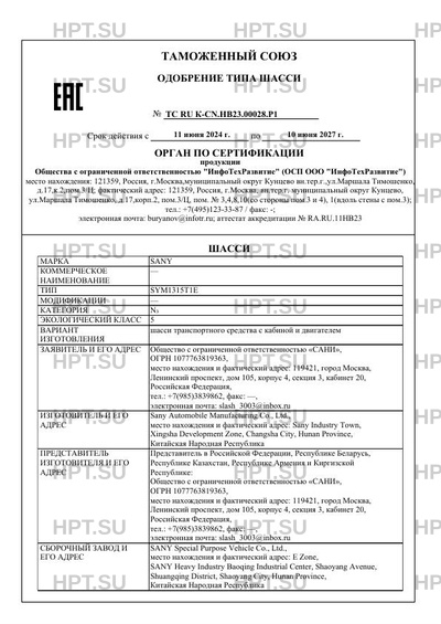 | Сборочный завод | SANY Special Purpose Vehicle Co., Ltd., место нахождения и фактический адрес: E Zone, SANY Heavy Industry Baoqing Industrial Center, Shaoyang Avenue, Shuangqing District, Shaoyang City, Hunan Province, Китайская Народная Республика |