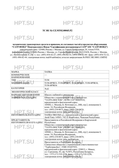 | Предприятие-изготовитель | TATRA TRUCKS a.s., юридический и фактический адрес: Arel Tatry 1450/1, 742 21 Kopivnice, Чешская Республика |