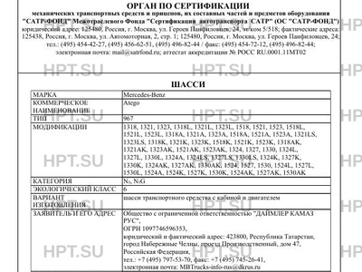 | Представитель изготовителя | Представитель в Российской Федерации: Общество с ограниченной ответственностью "ДАЙМЛЕР КАМАЗ РУС", ОГРН 1097746596353, юридический и фактический адрес: 423800, Республика Татарстан, город Набережные Челны, проезд Производственный, дом 47, Российская Федерация, тел.: +7 (495) 797-5 Представитель в Республике Беларусь: Общество с ограниченной ответственностью "АВТОМОБИЛЬНЫЙ ДОМ "ЭНЕРГИЯ ГМБХ", УНП 100364357, юридический и фактический адрес: 220035, город Минск, улица Тимирязева, дом 68, Республика Беларусь, тел.: + 7 375 17 309-9999, факс: + 7 375 17 309-9999, электронная почта: info@mercedes-benz.by Представитель в Республике Казахстан и Киргизской Республике: Tоварищество с ограниченной ответственностью "Автокапитал", БИН 080240015356, юридический и фактический адрес: 050054, город Алматы, улица Стасова, дом 102, Республика Казахстан, тел.: +7 727 250 64 24, факс: +7 727 250 90 81, электронная почта: info@autokapital.com Представитель в Республике Армения: Общество с ограниченной ответственностью "Авангард Моторс", УНН 26411006069, юридический и фактический адрес: 0056, город Ереван, проспект Гая, 14/3, Республика Армения, тел.: +7 374-60-680000, факс: +7 374-10-668900, электронная почта: agm@mercedes-benz.am |