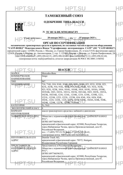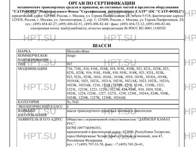 | Представитель изготовителя | Представитель в Российской Федерации: Общество с ограниченной ответственностью "ДАЙМЛЕР КАМАЗ РУС", ОГРН 1097746596353, юридический и фактический адрес: 423800, Республика Татарстан, город Набережные Челны, проезд Производственный, дом 47, Российская Федерация тел.: +7 (495) 797-5 |