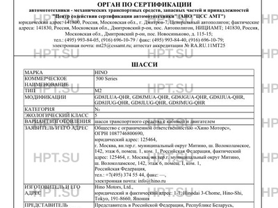 Заявитель Общество с ограниченной ответственностью "Хино Моторс", ОГРН 1087746800690, юридический адрес: 125464, г. Москва, вн.тер.г. муниципальный округ Митино, ш. Волоколамское, 142, этаж 6, помещ. 1, ком. 1, Российская Федерация, фактический адрес: 125464, г. Москва, вн.тер.г. муниципальный округ Митино, ш. Волоколамское, 142, этаж 6, помещ. I, ком. 1, Российская Федерация, тел.: +7(495) 374 55 44, факс: -, электронная почта: info@hino.ru