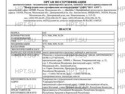 | Заявитель | Общество с ограниченной ответственностью "ДЖАК АВТОМОБИЛЬ", ОГРН 1127746758391, юридический адрес: 109004, г. Москва, Товарищеский пер., д. 31, стр. 5, Российская Федерация, фактический адрес: 142703, Московская обл., Ленинский р-он, г.п. Горки Ленинские, Промзона Пуговичино, вл. 8, Российская Федерация, тел.: +7 (495) 789 44 88, факс: +7 (495) 789 44 88, электронная почта: russia@jac.com.cn |