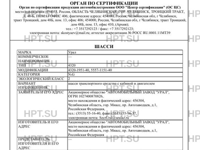 | Предприятие-изготовитель | Акционерное общество "АВТОМОБИЛЬНЫЙ ЗАВОД "УРАЛ", место нахождения и фактический адрес: 456304, Челябинская область, гор. Миасс, пр. Автозаводцев, д.1, Российская Федерация |
