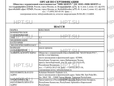 Предприятие-изготовитель Koluman Otomotiv Endustri A.S., место нахождения и фактический адрес: Sahin Mh. Sait Polat Blv. No: 386/C TR - 33800 Tarsus Mersin, Турецкая Республика