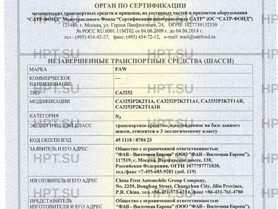 | Экологический класс | транспортное средство, изготовленное на базе данного шасси, относится к 3 экологическому классу |