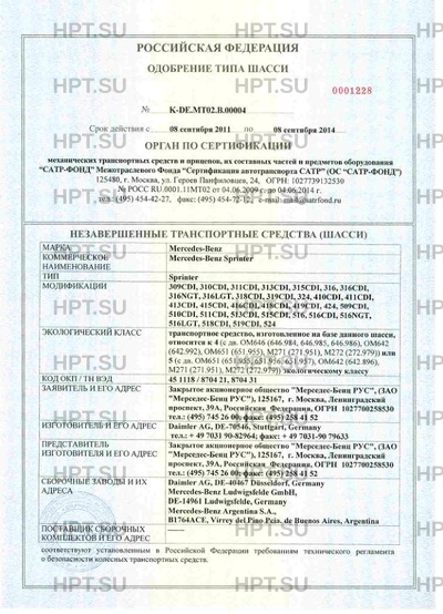 Экологический класс | 4 или 5 Транспортное средство, изготовленное на базе данного шасси, относится к 4 (с дв. ОМ646 (646,984,646,985,646,986), ОМ642 (642.992), ОМ651(651.955), М271 (271.951), М271 (271.951), М272 (272.979) или 5 (с дв.ОМ651 (651.955, 651.956, 651.957), ОМ642 (642.896), М271 (271.951), М272 (272 (272.979)) экологическому классу |