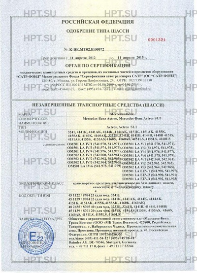 | Заявитель | Общество с ограниченной ответственностью "Мерседес Бенц Тракс Восток" (ООО "М1> Тракс Восток"), 423800, Республика Татарстан, г. Набережные Челны, Промышленно-коммунальная зона, Промзона, Производственный проезд, д. 47, Российская Федерация, ОГРН 1097746596353 тел ./фа КС (495) 411-54-12 / (495) 745 26-41 |