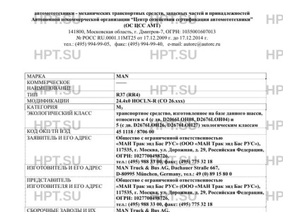 | Представитель изготовителя | Общество с ограниченной ответственностью "МАН Трак энд Бас РУС" (ООО "МАН Трак энд Бас РУС"), 117535, г. Москва, ул. Дорожная, д. 29, Российская Федерация, ОГРН: 1027700498726, тел.: (495) 988 33 00, факс: (495) 775 32 18 |