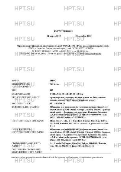 Заявитель Общество с ограниченной ответственностью «Хино Мот-торс Сэйлс» (ООО «Хино Моторс Сэйлс»), 690106, Примор-ский край, г. Владивосток, проспект Красного Знамени, д.3, Российская Федерация, ОГРН: 1087746800690, тел.: (4232) 600-003, факс: (4232) 600-033