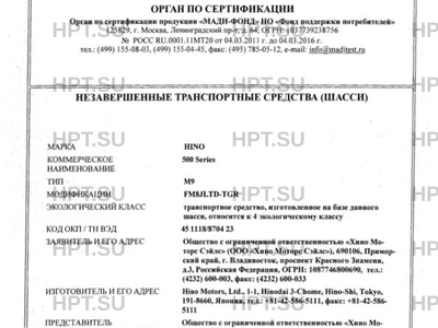 | Заявитель | Общество с ограниченной ответственностью "Хино Мо-торс Сэйлс" (ООО "Хино Моторс Сэйлс"), 690106, Примор-ский край, г. Владивосток, проспект Красного Знамени, д.3, Российская Федерация, ОГРН: 1087746800690, тел.: (4232) 600-003, факс: (4232) 600-033 |