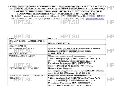 | Заявитель | Общество с ограниченной ответственностью "Хндэ КомТранс Рус" (ООО "Хндэ КомТранс Рус"), 107113, г. Москва, ул. Сокольнический вал, д. 1а, Российская Федерация, ОГРН 1047796552704, тел.: +7 (499) 795-26-96, факс: +7 (499) 75 |