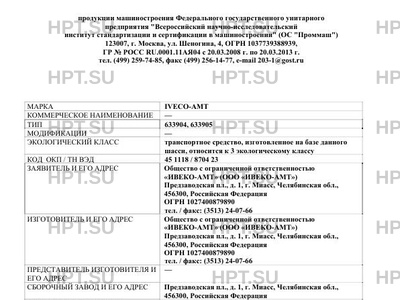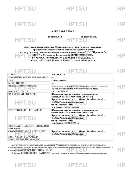 | Заявитель | Общество с ограниченной ответственностью "ИВЕКО-АМТ" (ООО "ИВЕКО-АМТ") Предзаводская пл., д. 1, г. Миасс, Челябинская обл., 456300, Российская Федерация ОГРН 1027400879890 тел. / факс: (3513) 24-07-66 |