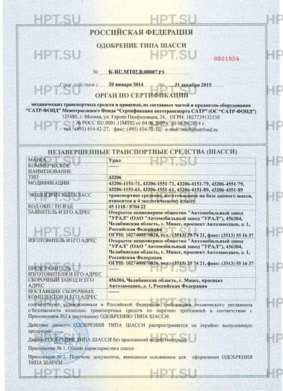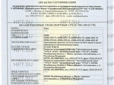 | Предприятие-изготовитель | Открытое акционерное общество "Автомобильный завод "УРАЛ" (ОАО "Автомобильный завод "УРАЛ"), 456304, Челябинская область, г. Миасс, проспект Автозаводцев, д. 1, Российская Федерация ОГРН: 1027400870826, тел.: (3513) 29 74 21, факс: (3513) 55 16 37 |