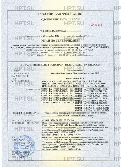 | Заявитель | Общество с ограниченной ответственностью "Мерседес-Бенц Тракс Восток" (ООО "МБ Тракс Восток"), 423800, Республика Татарстан, г. Набережные Челны, Промышленно-коммунальная зона, Промзона, Производственный проезд, д. 47, Российская Федерация, ОГРН 1097746596353 тел./факс (495) 411-54-12 / (495) 745-26-41 |