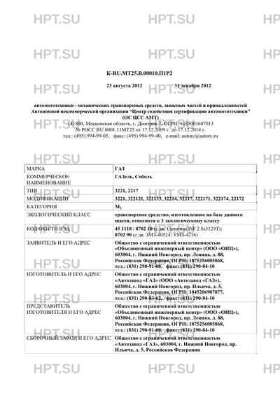 Сборочный завод Общество с ограниченной ответственностью "Автозавод ГАЗ г Нижний Новгород пр " ", 603004, . , . Ильича д Российская Федерация , . 5, K-RU.МТ25. .00010. В П Р 1 2 2