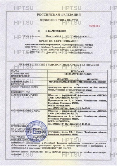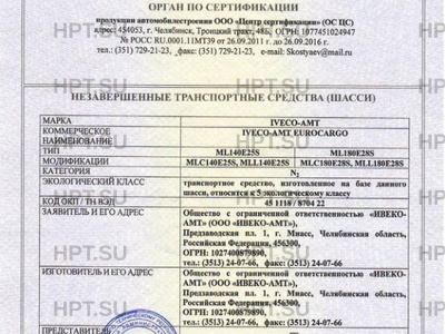 | Предприятие-изготовитель | Общество с ограниченной ответственностью "ИВЕКО-АМТ" (ООО "ИВЕКО-АМТ"), Предзаводская пл. 1, г. Миасс, Челябинская область, Российская Федерация, 456300, ОГРН: 1027400879890, тел.: (3513) 24-07-66, факс: (3513) 24-07-66 |