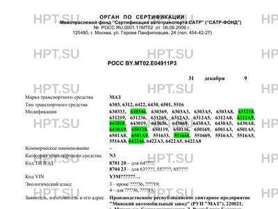 | Оборудование ТС | автономный отопитель кабины, предпусковой подогреватель двигателя, кондиционер (хладагент R134a), центральный редуктор отбора мощности; для 64???? - коробка отбора мощности; для 63???? - коробка отбора мощности, лебедка При проезде транспортных средств МАЗ по автомобильным дорогам общего пользования, а также по улицам городов и населенных пунктов должны быть выполнены требования "Инструкции по перевозке крупногабаритных и тяжеловесных грузов автомобильным транспортом по дорогам Российской Федерации". 17 |