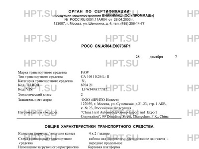 | Предприятие-изготовитель | "China First Automobile Group Import and Export Corporation", 99 Dongfeng Street, Changchun, P.R., China |