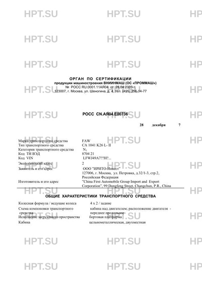 | Предприятие-изготовитель | "China First Automobile Group Import and Export Corporation", 99 Dongfeng Street, Changchun, P.R., China |