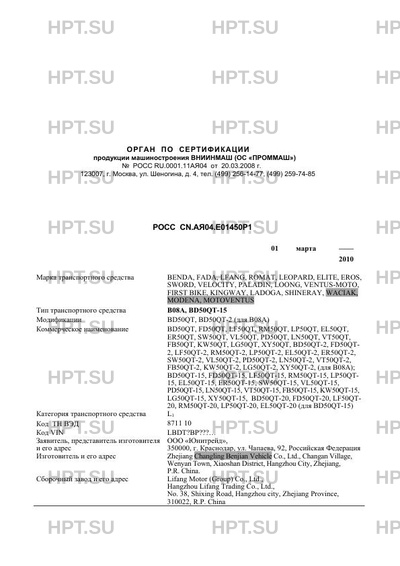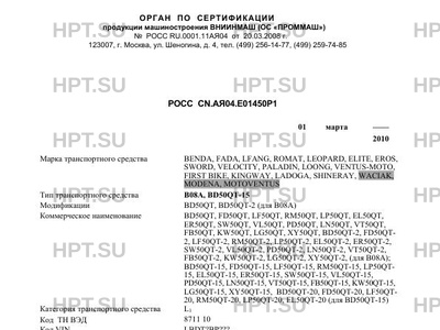 | Марка ТС | BENDA, FADA, LFANG, ROMAT, LEOPARD, ELITE, EROS, SWORD, VELOCITY, PALADIN, LOONG, VENTUS-MOTO, FIRST BIKE, KINGWAY, LADOGA, SHINERAY, WACIAK, MODENA, MOTOVENTUS |