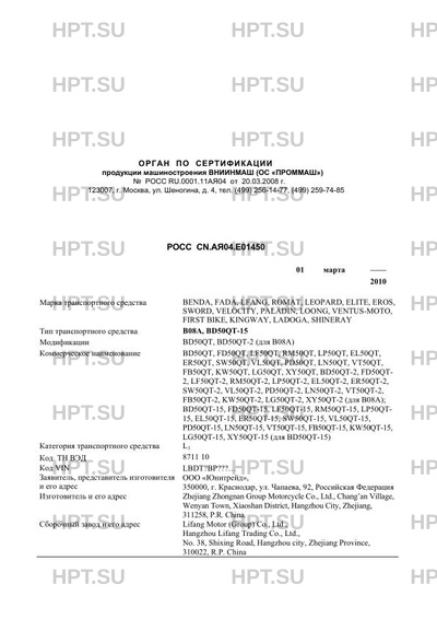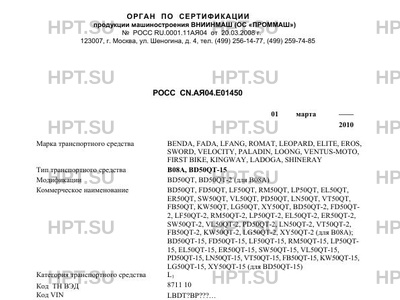 | Марка ТС | BENDA, FADA, LFANG, ROMAT, LEOPARD, ELITE, EROS, SWORD, VELOCITY, PALADIN, LOONG, VENTUS-MOTO, FIRST BIKE, KINGWAY, LADOGA, SHINERAY |