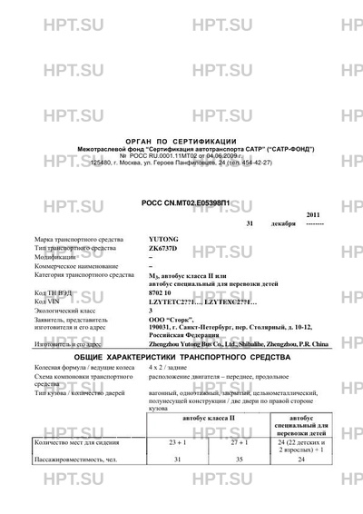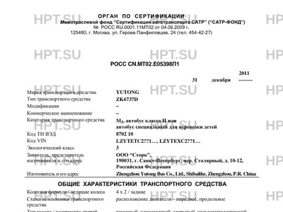| Категория ТС | M3, автобус класса II или автобус специальный для перевозки детей |
