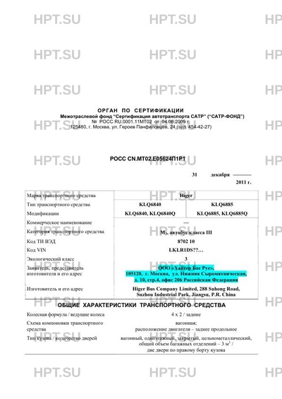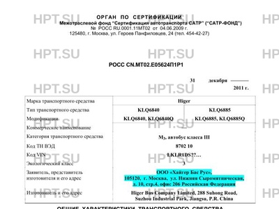 | Оборудование ТС | кондиционер (хладагент R-134A), аудио-видеосистема, видеосистема заднего обзора, электронные часы, система климат-контроля салона (хладагент R-134A) Higer KLQ6840, KLQ6885 |