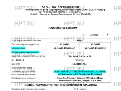 | Оборудование ТС | кондиционер (хладагент R-134A), аудио-видеосистема, видеосистема заднего обзора, электронные часы, система климат-контроля салона (хладагент R-134A) Higer KLQ6840, KLQ6885 |