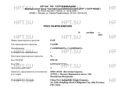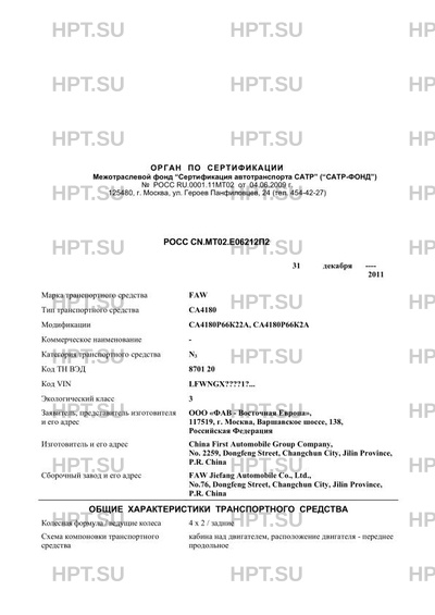 | Сборочный завод | FAW Jiefang Automobile Co., Ltd., No.76, Dongfeng Street, Changchun City, Jilin Province, P.R. China |