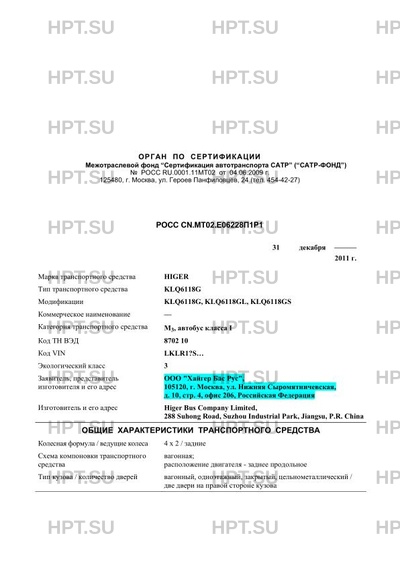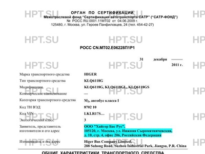 | Заявитель | ООО "Хайгер Бас Рус", 105120, г. Москва, ул. Нижняя Сыромятничевская, д. 10, стр. 4, офис 206, Российская Федерация |