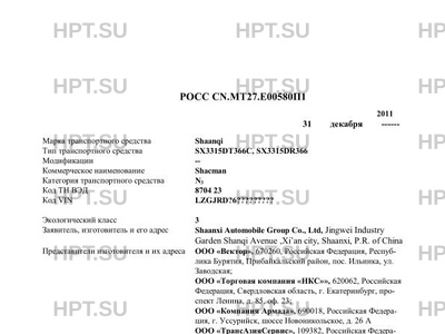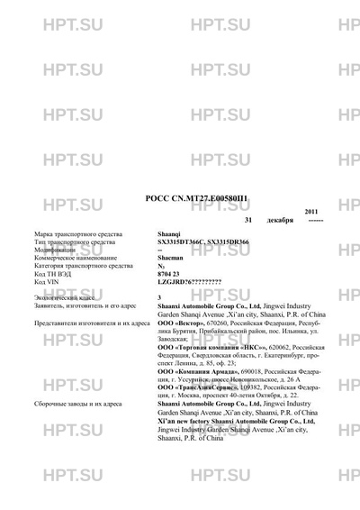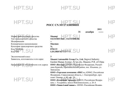 | Заявитель | Shaanxi Automobile Group Co., Ltd, Jingwei Industry Garden Shanqi Avenue ,Xi’an city, Shaanxi, P.R. of China Представители изготовителя и их адреса ООО "Вектор", 670260, Российская Федерация, Республика Бурятия, Прибайкальский район, пос. Ильинка, ул. Заводская; ООО "Торговая компания "НКС"", 620062, Российская Федерация, Свердловская область, г. Екатеринбург, проспект Ленина, д. 85, оф. 23; ООО "Компания Армада", 690018, Российская Федерация, г. Уссурийск, шоссе Новоникольское, д. 26 А ООО "ТрансАзияСервис", 109382, Российская Федерация, г. Москва, проспект 40-летия Октября, д. 22. |