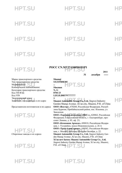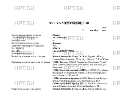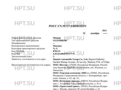 | Заявитель | Shaanxi Automobile Group Co., Ltd, Jingwei Industry Garden Shanqi Avenue ,Xi’an city, Shaanxi, P.R. of China Представители изготовителя и их адреса ООО «Вектор», 670260, Российская Федерация, Республика Бурятия, Прибайкальский район, пос. Ильинка, ул. Заводская; ООО «Торговая компания «НКС»», 620062, Российская Федерация, Свердловская область, г. Екатеринбург, проспект Ленина, д. 85, оф. 23; ООО «Компания Армада», 690018, Российская Федерация, г. Уссурийск, шоссе Новоникольское, д. 26 А ООО «ТрансАзияСервис», 109382, Российская Федерация, г. Москва, проспект 40-летия Октября, д. 22. |