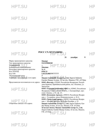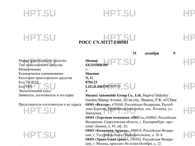 Заявитель Shaanxi Automobile Group Co., Ltd, Jingwei Industry Garden Shanqi Avenue ,Xi’an city, Shaanxi, P.R. of China Представители изготовителя и их адреса ООО «Вектор», 670260, Российская Федерация, Республика Бурятия, Прибайкальский район, пос. Ильинка, ул. Заводская; ООО «Торговая компания «НКС»», 620062, Российская Федерация, Свердловская область, г. Екатеринбург, проспект Ленина, д. 85, оф. 23; ООО «Компания Армада», 690018, Российская Федерация, г. Уссурийск, шоссе Новоникольское, д. 26 А ООО «ТрансАзияСервис», 109382, Российская Федерация, г. Москва, проспект 40-летия Октября, д. 22.