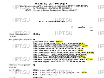Оборудование ТС в зависимости от комплектации возможна установка следующего оборудования: подушки безопасности; системы MSR, EDS, ASR; передние противотуманные фары; регулируемые по высоте сиденья водителя и переднего пассажира; центральный замок с дистанционным управлением или без него; электростеклоподъемники передних или всех дверей; тонированные стекла; электрообогрев передних сидений; кондиционер с хладагентом R134A; омыватель ветрового стекла с электрообогревом; наружные зеркала с электроприводом и электрообогревом; автомагнитола; навигационная система; оборудование для мобильной связи; аудиоподготовка; колеса из легких сплавов; люк с электроприводом; система помощи при парковке; буксирное устройство, кожаная обивка; автомобиль легковой ŠKODA 6Y (Fabia Junior-PA?6Y,PH?6Y,PW?6Y; FabiaClassic-PA?6Y,PH?6Y,PB?6Y,PC?6Y,PF?6Y,PD?6Y,PW?6Y; FabiaComfort-NH?6Y,NB?6Y,NC?6Y,NF?6Y,NS?6Y,ND?6Y, NW?6Y; FabiaElegance-MB?6Y,MC?6Y,MF?6Y,MS?6Y,MD?6Y,ME?6Y; FabiaCombiClassic-JB?6Y,JC?6Y,JF?6Y,JD?6Y,JH?6Y,JW?6Y; FabiaCombiComfort-HB?6Y,HC?6Y,HF?6Y,HS?6Y,HD?6Y,HH?6Y,HW?6Y; FabiaCombiElegance-GB?6Y,GC?6Y,GF?6Y,GS?6Y,GD?6Y,GE?6Y; FabiaSedan Classic-DB?6Y,DC?6Y,DF?6Y,DD?6Y,DH?6Y,DW?6Y; FabiaSedan Comfort-CB?6Y,CC?6Y,CF?6Y,CS?6Y,CD?6Y,CH?6Y,CW?6Y; FabiaSedan Elegance-BB?6Y,BC?6Y,BF?Y,BS?6Y,BD?6Y,BE?6Y)