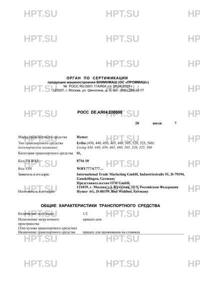 | Тип ТС | Eriba (430, 440, 450, 465, 480, 505, 520, 525, 560) (коммерческое название) Liv… |
