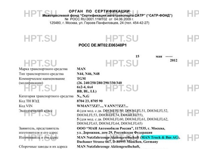 | Оборудование ТС | кондиционер (хладагент R134A), холодильник (хладагент R134A), аудио-, видеотехника, навигационная система, подушка безопасности, лебедка, дополнительные отопители "Eberspächer", "Webasto", "Truma Trumatic" При проезде транспортных средств по автомобильным дорогам общего пользования, а также по улицам городов и населенных пунктов, должны быть выполнены требования "Инструкции по перевозке крупногабаритных и тяжеловесных грузов автомобильным транспортом по дорогам Российской Федерации". MAN N44, N46, N48 |