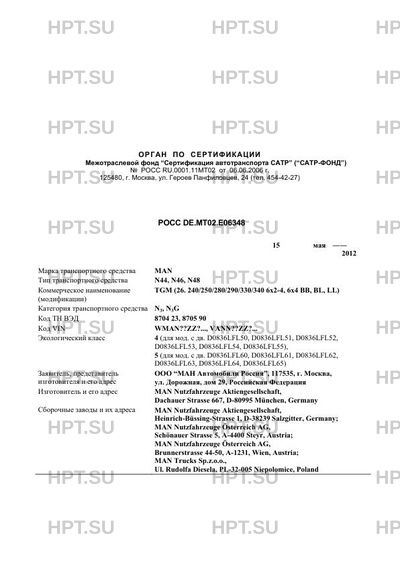 | Оборудование ТС | кондиционер (хладагент R134A), холодильник (хладагент R134A), аудио-, видеотехника, навигационная система, подушка безопасности, лебедка, дополнительные отопители "Eberspächer", "Webasto", "Truma Trumatic" При проезде транспортных средств по автомобильным дорогам общего пользования, а также по улицам городов и населенных пунктов, должны быть выполнены требования "Инструкции по перевозке крупногабаритных и тяжеловесных грузов автомобильным транспортом по дорогам Российской Федерации". MAN N44, N46, N48 |
