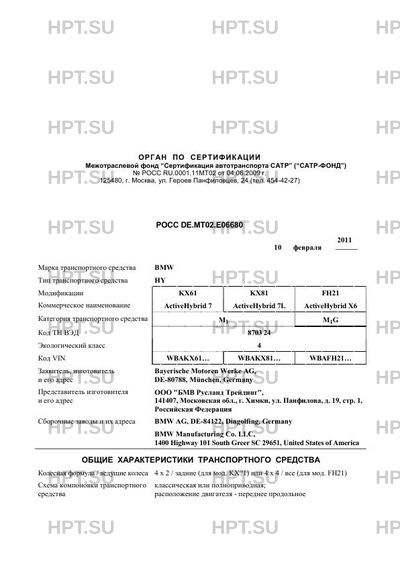 | Предприятие-изготовитель | Bayerische Motoren Werke AG, DE-80788, Munchen, Germany BMW AG, DE-84122, Dingolfing, Germany BMW Manufacturing Co. LLC, 1400 Highway 101 South Greer SC 29651, United States of America |