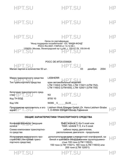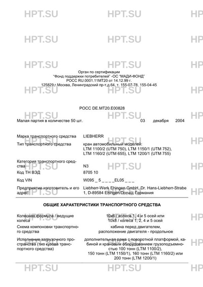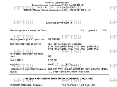 | Тип ТС | кран автомобильный моделей: LTM 1100/2 (UTM 750), LTM 1150/1 (UTM 752), LTM 1160/2 (UTM 655), LTM 1200/1 (UTM 755) |