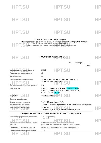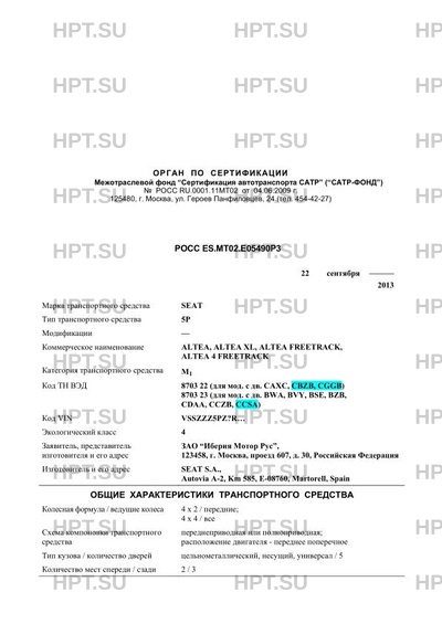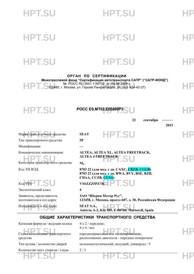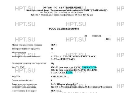 Код ТН ВЭД 8703 22 (для мод. с дв. CAXC, CBZB, CGGB) 8703 23 (для мод. с дв. BWA, BVY, BSE, BZB, CDAA, CCZB, CCSA)