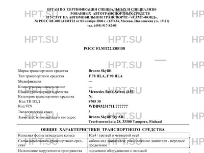 | Предприятие-изготовитель | АО "Бронто Скайлифт Аб". Тееривуоренкату 28, 33300 Тампере, Финляндия |