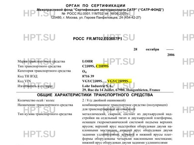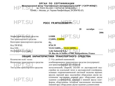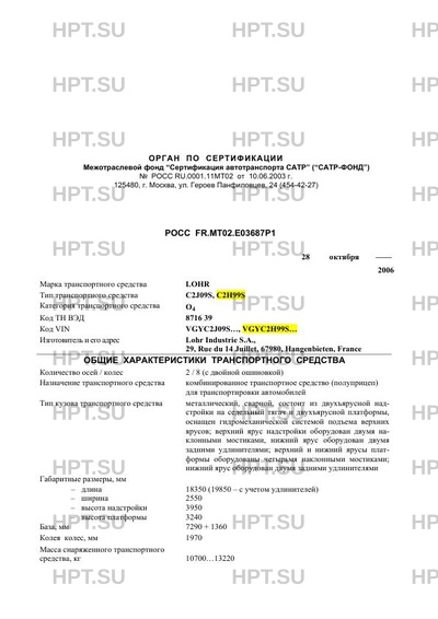 | Оборудование ТС | упоры для фиксации наклонных мостиков, противооткатные упоры для колес перевозимых автомобилей, специальные крепежные ремни Транспортное средство LOHR C2J09S, C2H99S должно эксплуатироваться только в комплексе с тягачом, прошедшим установленную на территории Российской Федерации процедуру сертификации. При проезде транспортных средств LOHR C2J09S, C2H99S по автомобильным дорогам общего пользования, а также по улицам городов и населенных пунктов должны быть выполнены требования "Инструкции по перевозке крупногабаритных и тяжеловесных грузов автомобильным транспортом по дорогам Российской Федерации". полуприцеп для транспортировки легковых автомобилей LOHR C2J09S, C2H99S |