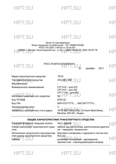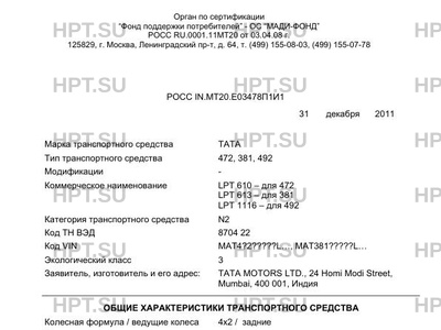 | Предприятие-изготовитель | ТАТА MOTORS LTD., 24 Homi Modi Street, Mumbai, 400 001, Индия |