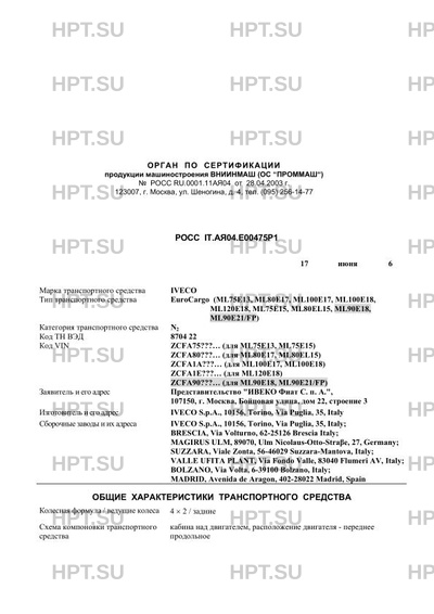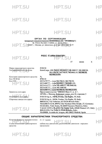 | Предприятие-изготовитель | IVECO S.p.A., 10156, Torino, Via Puglia, 35, Italy; Сборочные заводы и их адреса: IVECO S.p.A., 10156, Torino, Via Puglia, 35, Italy; BRESCIA, Via Volturno, 62-25126 Brescia Italy; MAGIRUS ULM, 89070, Ulm Nicolaus-Otto-Stra?e, 27, Germany; SUZZARA, Viale Zonta, 56-46029 Suzzara-Mantova, Italy; VALLE UFITA PLANT, Via Fondo Valle, 83040 Flumeri AV, Italy; BOLZANO, Via Volta, 6-39100 Bolzano, Italy; MADRID, Avenida de Aragon, 402-28022 Madrid, Spain |