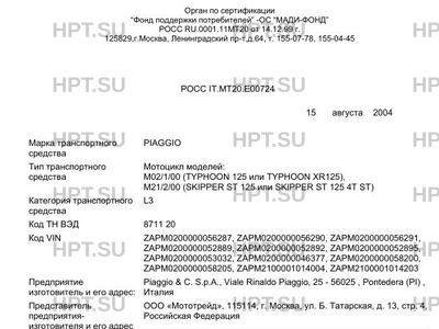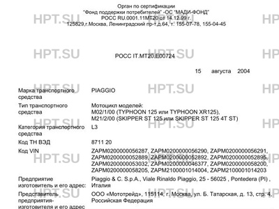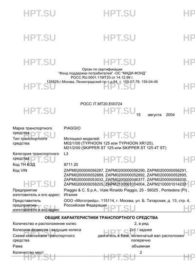 | Тип ТС | Мотоцикл моделей: M02/1/00 (TYPHOON 125 или TYPHOON XR125), M21/2/00 (SKIPPER ST 125 или SKIPPER ST 125 4Т ST) |